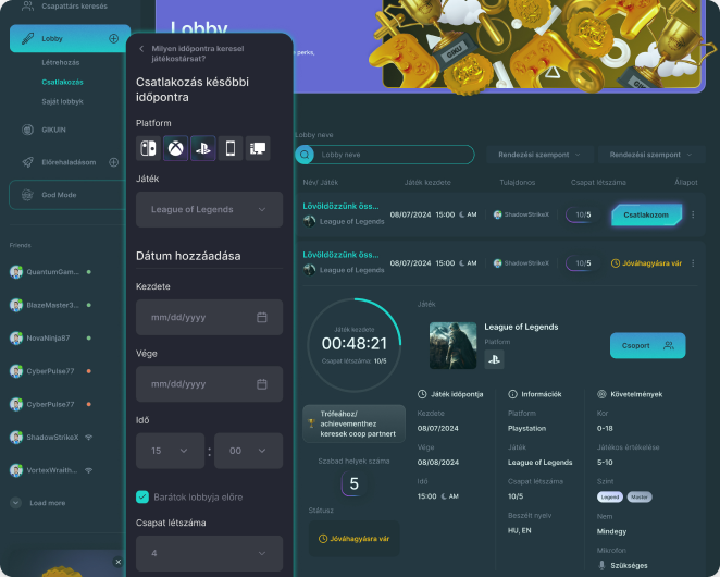 Not available right now? Set the time and your other requirements, then decide which applicants make your team — or just join someone else’s lobby.